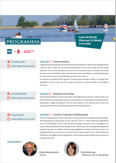 Het FSP organiseert in samenwerking met de Rijksuniversiteit Groningen een korte cursus van 3 dagdelen over brede welvaart & beleid in Fryslân. Met o.a. prof. dr. Anet Weterings (PBL/RUG), Klaas Sietse Spoelstra (Nij Sicht), dr. Wouter Marchand (FSP), dr. Ymko Braaksma (FSP) en prof. dr. Marijn Molema (FSP/RUG).