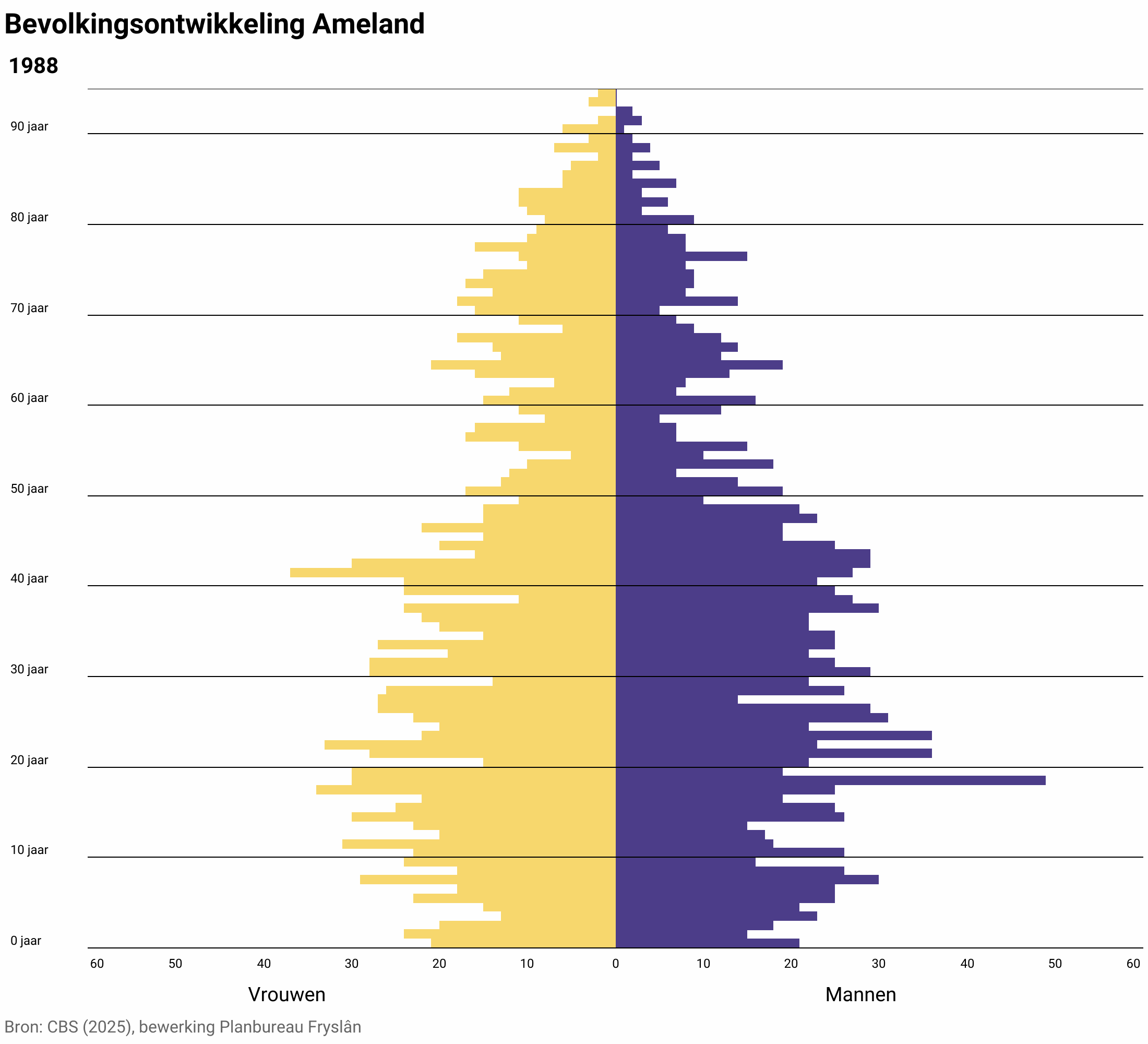 Naast de algehele krimp van de bevolking vergrijst en ontgroent Ameland ook. Naar verwachting zijn er in 2040 ruim 60 meer 65-plussers dan in 2025. Dat is een relatief kleine toename (7%), maar met de kleine bevolking van Ameland en de verwachte bevolkingskrimp betekent het dat het nu al relatief hoge percentage van 26 procent van de bevolking dat boven de 65 is toeneemt tot 29 procent. Gemiddeld over heel Fryslân ligt dit percentage in 2040 waarschijnlijk op 28 procent.