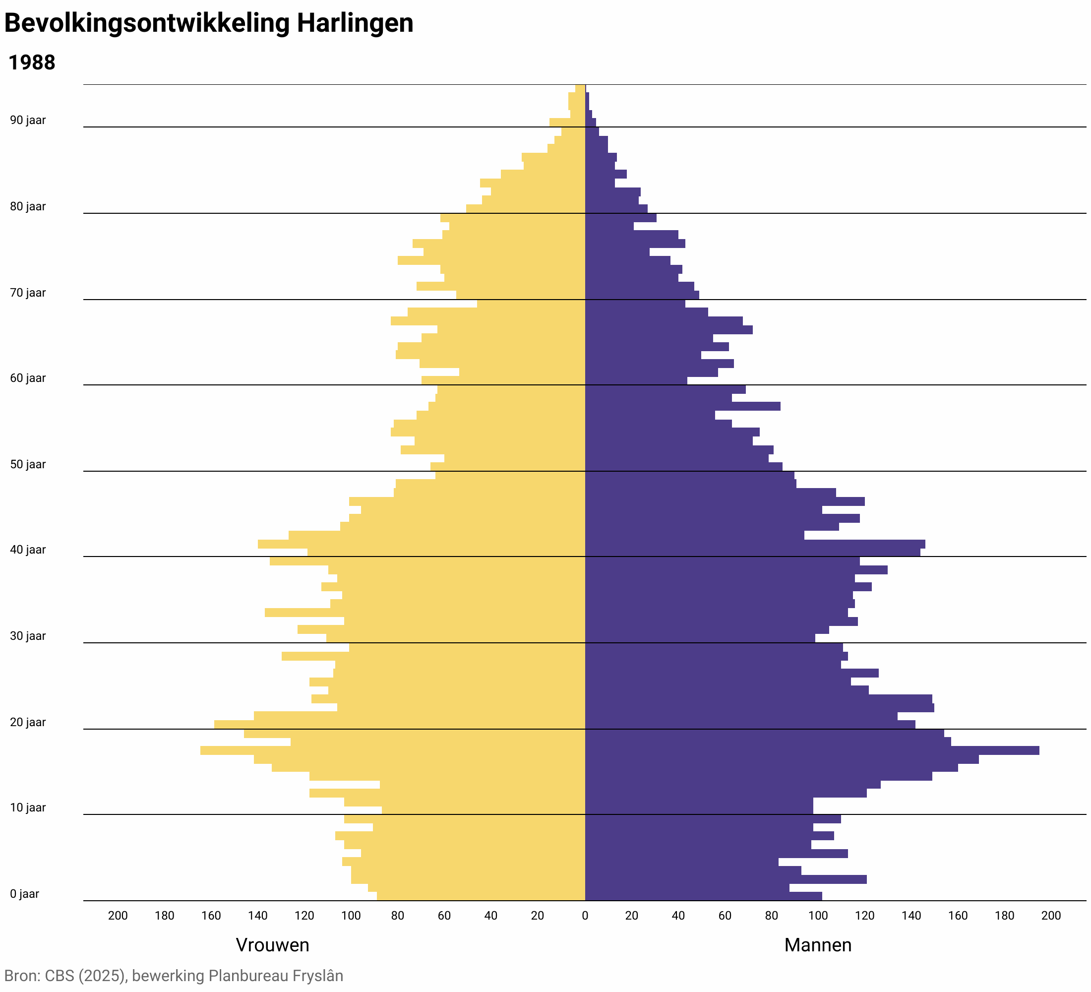 Harlingen heeft net als de rest van Fryslân steeds meer te maken met vergrijzing. Zo is de verwachting dat er in 2040 ruim 1000 meer 65-plussers zijn dan in 2025. Dat is een toename van 24 procent. Op dit moment is 27 procent van de inwoners van Harlingen 65 jaar of ouder. Daarmee is de vergrijzing in Harlingen sterker dan elders in Fryslân. Verder neemt de levensverwachting toe, waardoor het aantal mensen boven de 75 jaar toeneemt. Dit wordt ook wel dubbele vergrijzing genoemd (CBS, 2025d).