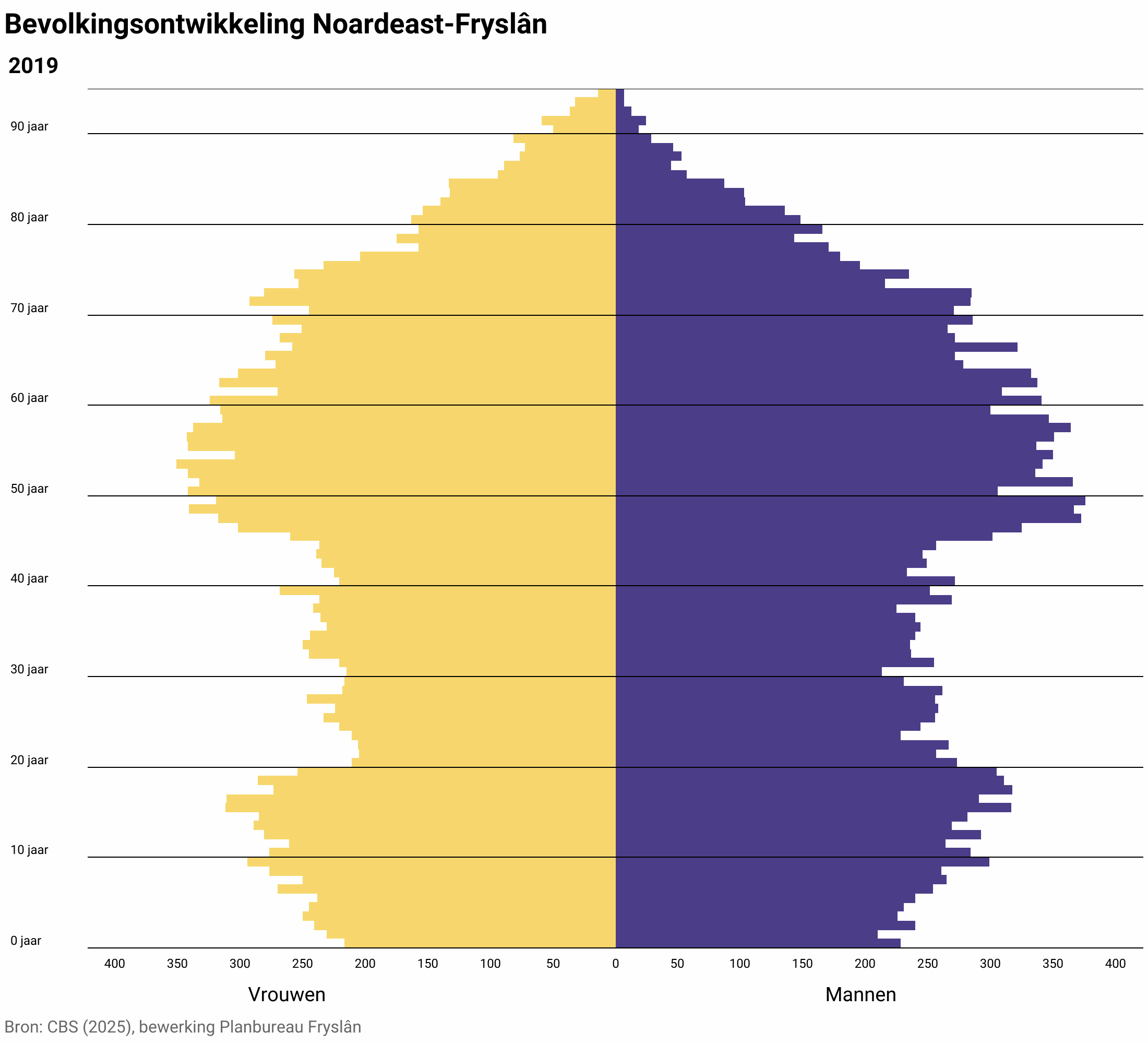 Noardeast-Fryslân heeft net als de rest van Fryslân steeds meer te maken met vergrijzing. Zo is de verwachting dat er in 2040 ruim 3850 meer 65-plussers zijn dan in 2020. Dat is een toename van 40 procent. Op dit moment is 23 procent van de inwoners van Noardeast-Fryslân 65 jaar of ouder. De verwachting is dat dit aandeel in 2040 is gestegen naar 29 procent van de bevolking (Provincie Fryslân, 2024). Daarmee is de vergrijzing vergelijkbaar met Fryslân, maar hoger dan gemiddeld in Nederland. Verder neemt de levensverwachting toe, waardoor het aantal mensen boven de 75 jaar toeneemt. Dit wordt ook wel dubbele vergrijzing genoemd (CBS, 2025a).