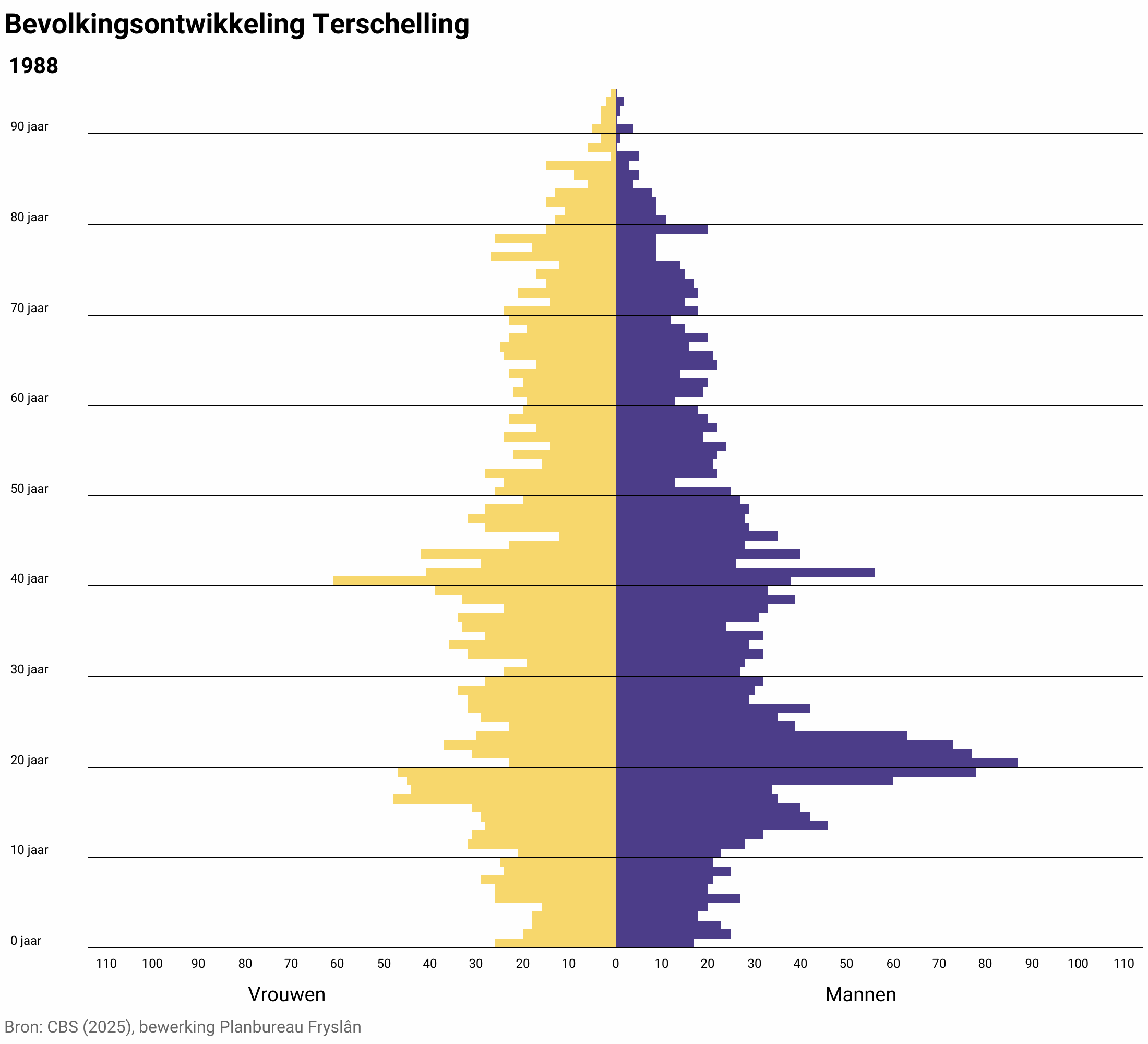 Terschelling heeft net als de rest van Fryslân steeds meer te maken met vergrijzing . Zo is de verwachting dat er in 2040 ruim 200 meer 65-plussers zijn dan in 2025 . Op dit moment is 25 procent van de inwoners van Terschelling 65 jaar of ouder, naar verwachting is dit in 2040 zo’n 34 procent. Voor de demografische prognoses geldt dat hoe kleiner het gebied is, hoe onzekerder de uitkomsten zijn op langere termijn, uitkomsten op gemeenteniveau van Terschelling moeten dus als indicatief worden beschouwd. De vergrijzing op Terschelling is net wat sterker dan elders in Fryslân, maar zal deze in de toekomst een stuk sterker zijn. Verder neemt de levensverwachting toe, waardoor het aantal mensen boven de 75 jaar toeneemt. Dit wordt ook wel dubbele vergrijzing genoemd (CBS, 2025).