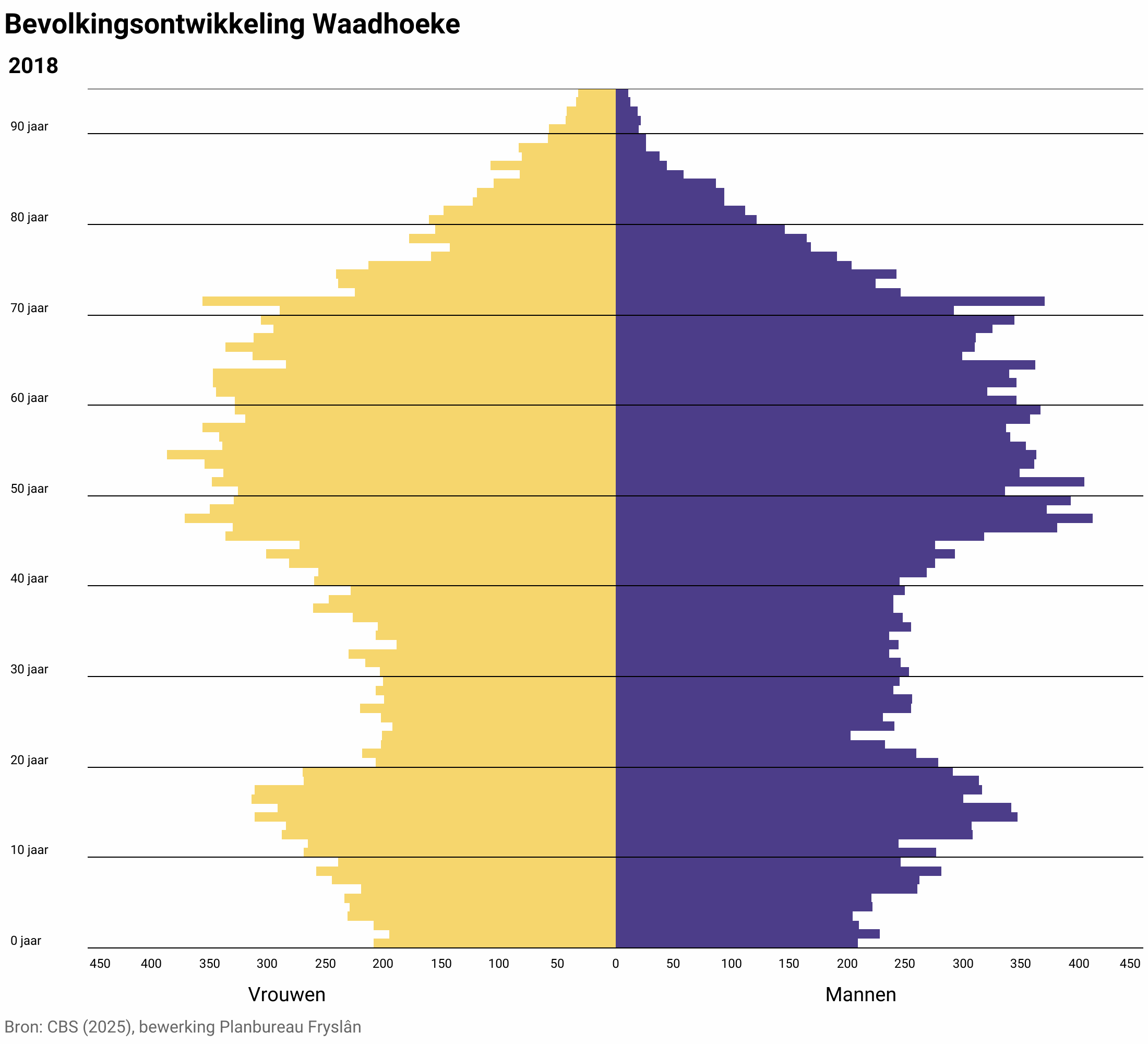 Waadhoeke heeft net als de rest van Fryslân te maken met vergrijzing en ontgroening. Naar verwachting zijn er in 2040 bijna 2500 meer 65-plussers dan in 2025 (Provincie Fryslân, 2024). Daarmee zijn er in 2040 21 procent meer 65-plussers dan in 2025. Op dit moment is 24 procent van de inwoners van Waadhoeke 65 jaar of ouder. Tegen 2040 wordt verwacht dat dit ongeveer 29 procent is. Verder neemt de levensverwachting toe, waardoor het aantal mensen boven de 75 jaar toeneemt. Dit wordt ook wel dubbele vergrijzing genoemd (CBS, 2025e).