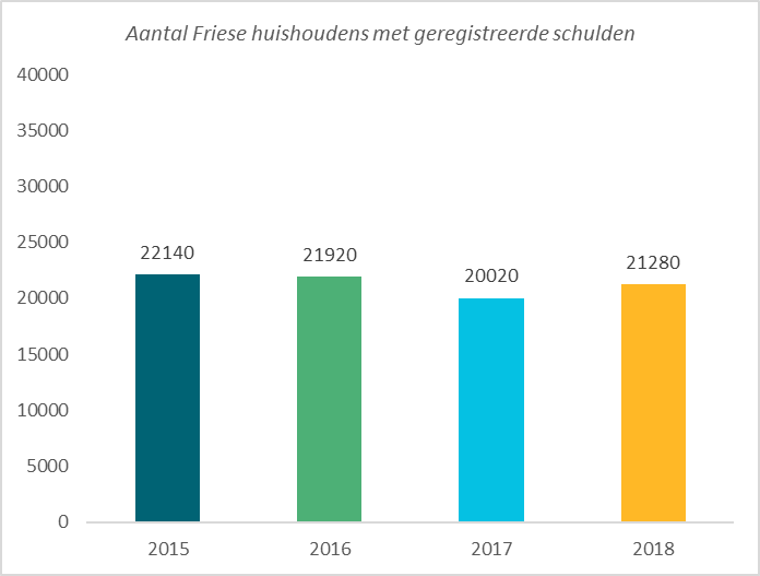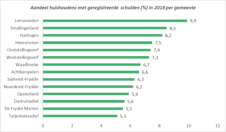 Van alle huishoudens met problematische schulden in Fryslân woont in 2018 de helft in de gemeente Leeuwarden (29%), Smallingerland (10%) en Súdwest-Fryslân (12%). Kijkend naar het aandeel (%) binnen de gemeenten ligt dit percentage het hoogst in de gemeenten Leeuwarden, Smallingerland en Harlingen in 2018. De Friese Waddeneilanden zijn wegens te kleine aantallen niet meegenomen in dit overzicht.