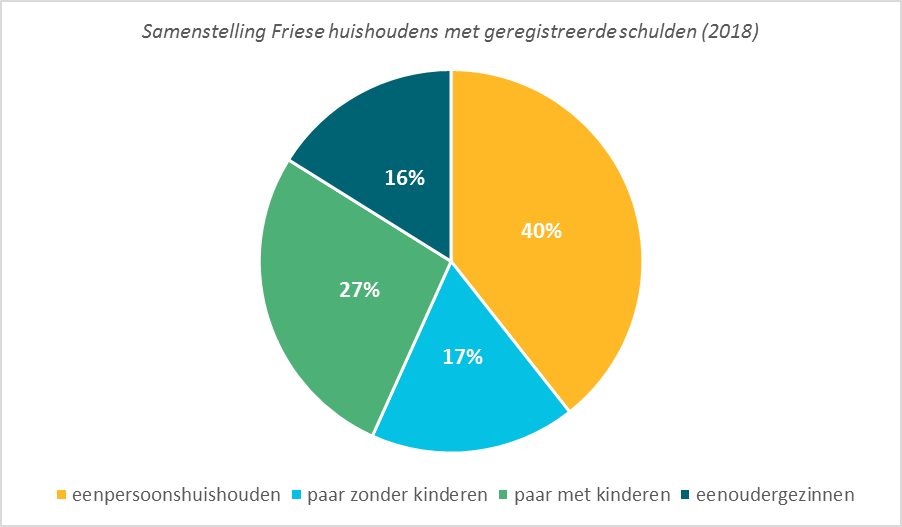 Ook zijn er verschillen qua samenstelling van deze huishoudens. Binnen 43% van de Friese huishoudens met problematische schulden wonen één of meer minderjarige of volwassen kinderen thuis. Van alle huishoudens met problematische schulden betreft 40% een eenpersoonshuishouden zonder kinderen.