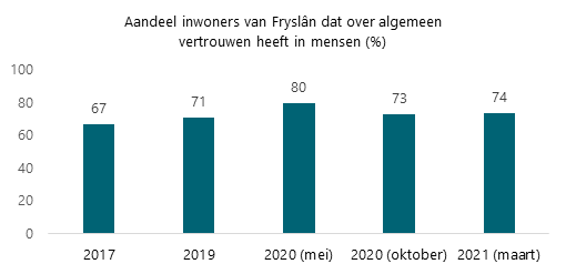 Zonder vertrouwen is er geen sprake van een samenleving en van sociale samenhang. Voor sociale relaties en alledaagse contacten is vertrouwen immers een belangrijke voorwaarde. We horen vaak dat mensen in Nederland elkaar niet meer vertrouwen. De FSP-monitor Sociale Samenhang laat echter zien dat dit beeld genuanceerder ligt. Wel zijn er verschillen tussen opleidingsgroepen: hoe hoger opgeleid, hoe meer vertrouwen men over het algemeen in andere mensen heeft (WRR, 2017). Voor en tijdens de coronacrisis is het Panel Fryslân bevraagd over het onderlinge vertrouwen. Een ruime meerderheid geeft aan dat de meeste mensen te vertrouwen zijn. Na een korte toename van dit vertrouwen in mei ’20 daalt de mate ervan in het najaar, maar blijft boven het niveau van voorgaande jaren.