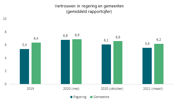 Naast het vertrouwen in andere mensen is ook vertrouwen in instanties, zoals overheden, politie en media belangrijk voor de sociale samenhang. Gedurende de coronacrisis stijgt en daalt dit vertrouwen. Na een opleving in het voorjaar van ’20 daalt het vertrouwen in instituties langzaam naar het oude niveau van voor de coronacrisis. Deze ontwikkeling is verklaarbaar. In tijden van plotselinge nationale bedreigingen van buitenaf zijn mensen geneigd om zich dikwijls eensgezind te scharen achter regeringsleiders en andere autoriteiten. Vaak wordt er dan van deze instituties verwacht dat zij zorgen voor stabiliteit, duidelijkheid en zekerheid. Dit fenomeen staat bekend als de ‘rally round the flag’ (SCP, 2020; Mueller, 1970). De vertrouwensbonus is daarbij vaak van tijdelijke aard.