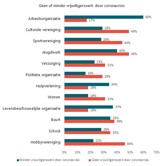 Fryslân is de provincie met het hoogste aandeel vrijwilligers. De FSP-monitor Sociale Samenhang laat zien dat 44 procent van de inwoners in 2019 vrijwilligerswerk deed. Voor het alledaagse leven en de sociale samenhang is vrijwilligerswerk belangrijk, omdat vrijwilligers en actieve inwoners bijdragen aan de verbinding tussen mensen in een buurt, wijk, dorp of stad. In maart ’21 is aan het Panel Fryslân gevraagd of zij door de coronacrisis en maatregelen geen of minder vrijwilligerswerk zijn gaan doen. Een aanzienlijk deel geeft aan daadwerkelijk minder of geen vrijwilligerswerk te verrichten, al verschilt dit wel per vrijwilligerswerkterrein.