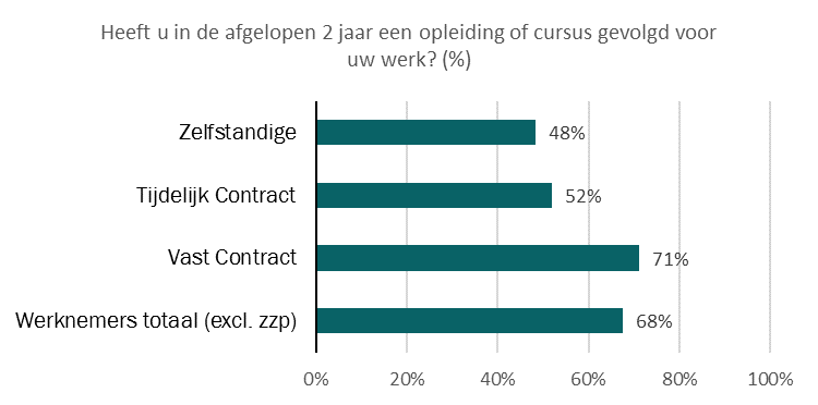 In Fryslân volgen hoogopgeleiden en werkenden met een vast contract het vaakst een opleiding of cursus voor hun werk. Zo heeft 78 procent van de hoogopgeleiden in de afgelopen twee jaar een opleiding of cursus gevolgd, vaker dan middelbaar (64%) en laagopgeleiden (45%). Deze bevindingen sluiten aan bij het landelijke beeld. Het is opvallend dat zelfstandigen aangeven tevredener te zijn met hun mogelijkheid om te leren dan werknemers, terwijl zij het minst vaak een opleiding of cursus volgen. Wellicht compenseren zij dit via het leren op de werkvloer, of wel ‘on-the-job’. Dit vraagt om nader onderzoek.