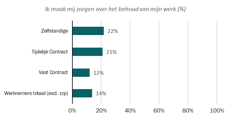 Hoe ervaren werkenden in Fryslân deze onzekerheid? Gevraagd naar de zorgen over het behoud van werk blijkt dat zelfstandigen en flexibel werkenden zich hier meer zorgen over maken. Het is opvallend dat zelfstandigen en tijdelijk werkenden in dezelfde mate zorgen ervaren, gezien het feit dat zelfstandigen over andere aspecten van hun werk wel tevredener zijn dan tijdelijk werkenden. Daarbij gaat het zoal om gevoel van vrijheid, zelf baas kunnen zijn en het kunnen combineren van werk en privé. Bezorgdheid over werkbehoud lijkt niet negatief uit te pakken op de tevredenheid over andere aspecten van werk. Landelijk maakt 16 procent van alle werknemers (excl. zzp) zich zorgen over werkbehoud (TNO, 2018). In Fryslân ligt dit aandeel iets lager (14%).