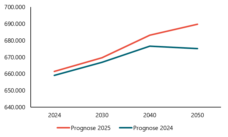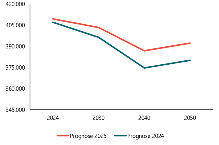 Figuur 1: Verwachte ontwikkeling potentiële beroepsbevolking– prognoses 2024 vs. 2025