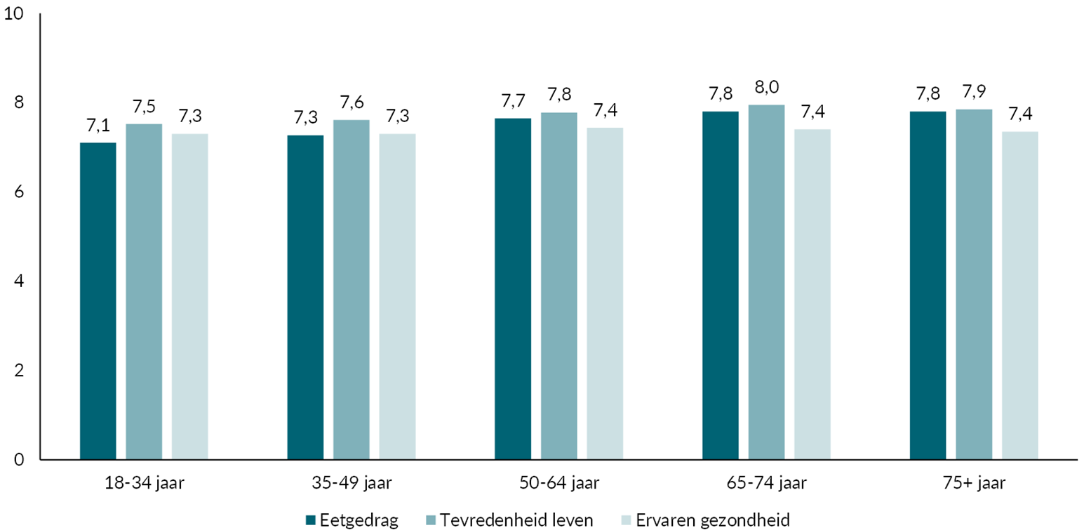 Naast positieve gezondheid zijn er ook tal van andere indicatoren waarop we een breder beeld kunnen krijgen van de gezondheid bij inwoners. Zo geven de inwoners van Fryslân zichzelf gemiddeld een 7,6 voor hun eetgedrag, een 7,8 voor hun tevredenheid met het leven en een 7,4 voor hun ervaren gezondheid. De jongere inwoners van Fryslân (18-34 jaar) geven zichzelf een lager rapportcijfer op deze punten. Er is een doorlopende toename te zien naar mate de inwoners ouder zijn. Zo geven de 65-74-jarigen en 75 plussers in Fryslân hunzelf een hoger cijfer op alle drie onderdelen.