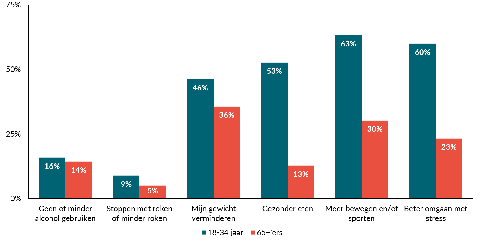 Als we het uitsplitsen naar leeftijdsgroepen blijkt dat onder ouderen (65+’ers) bij alle categorieën een kleiner aandeel deze gezondheidsdoelen hebben. Vooral onder jongere inwoners (18-34 jaar) is het aandeel dat de gezondheidsdoelen wil behalen groot. Het grootste verschil is bij gezonder eten (-40%) en beter omgaan met stress (-37%).