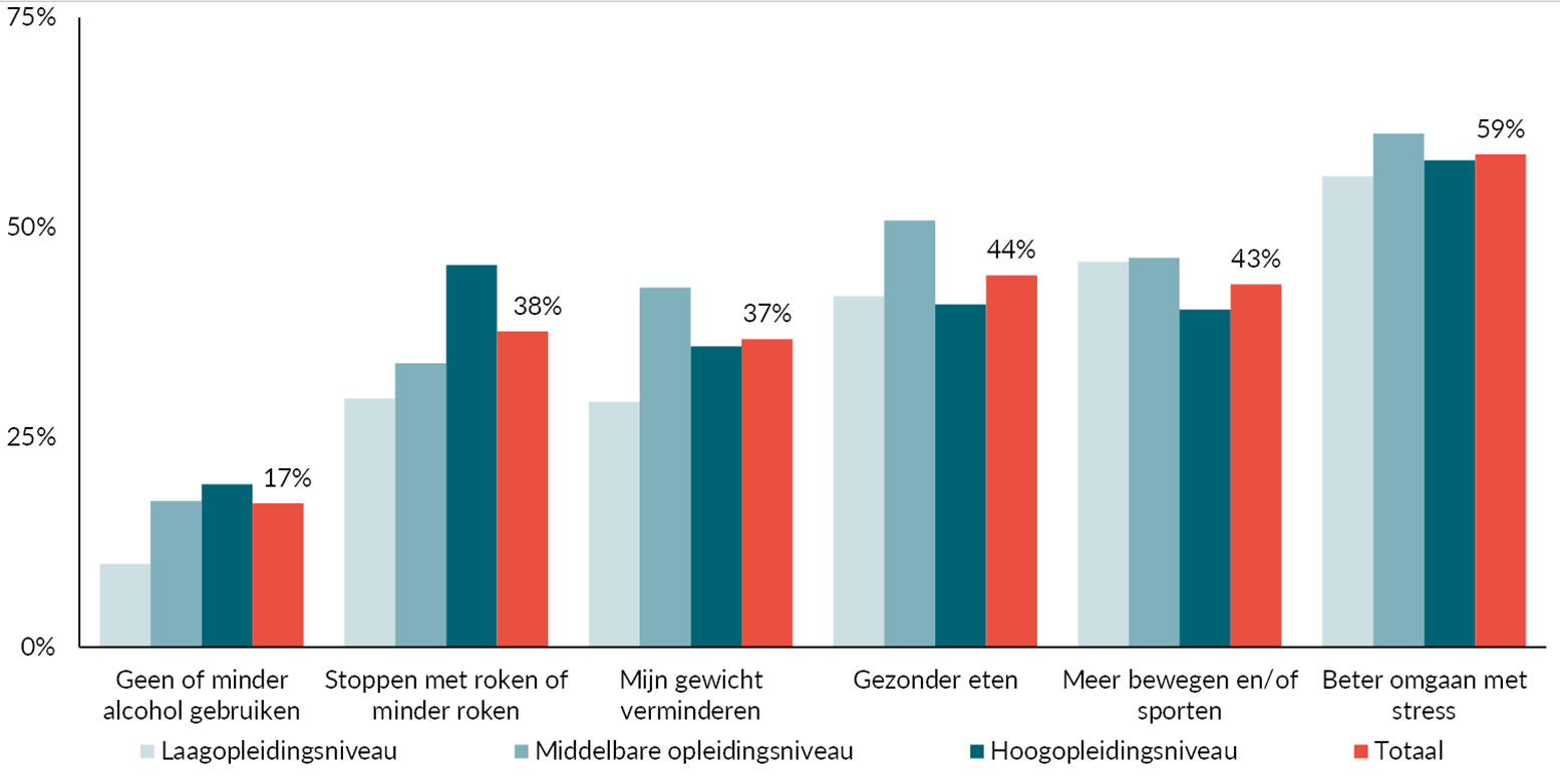 Sommige inwoners willen graag ondersteuning om hun gezondheidsdoelen te bereiken. Op de vraag of ze ondersteuning willen blijkt dat vooral dat inwoners met de gezondheidsdoel beter omgaan met stress daar behoefte aan hebben. Bij het gezondheidsdoel om geen of minder alcohol te drinken is deze behoefte het kleinst. Als we het uitsplitsen op opleidingsniveau zien we dat vooral de middelbare en hoogopgeleiden inwoners meer behoefte hebben aan ondersteuning.