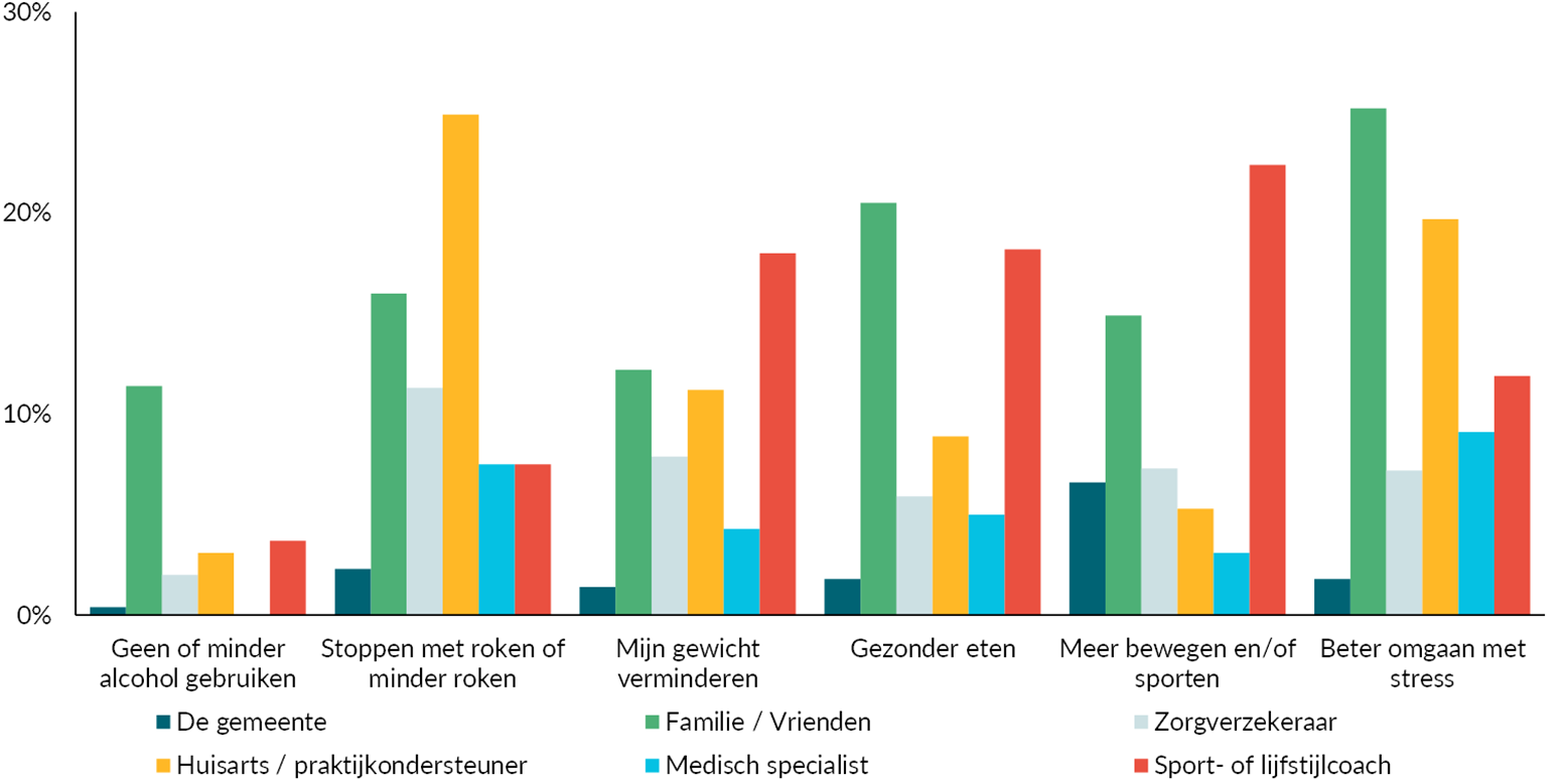 Om te begrijpen wie gewenste partijen zijn bij het behalen van de gezondheidsdoelen zijn de inwoners bevraagd om aan te geven wie ze al ondersteuner willen. Het vaakst zijn familie en vrienden, Huisarts/praktijkondersteuner en sport- en lijfstijlcoach genoemd. Familie en vrienden is wel de meest genoemde partij bij drie van de zes gezondheidsdoelen. Onderaan staat de gemeente en medisch specialist.