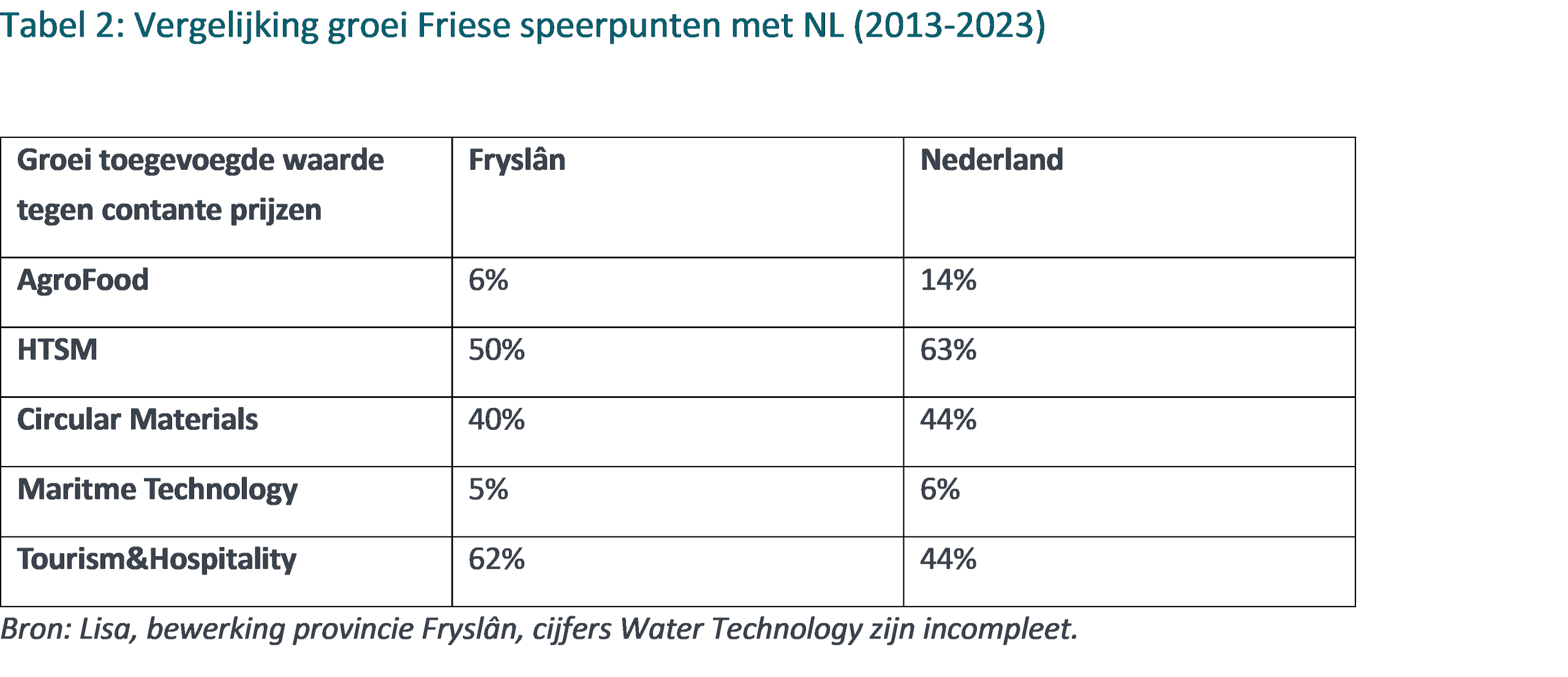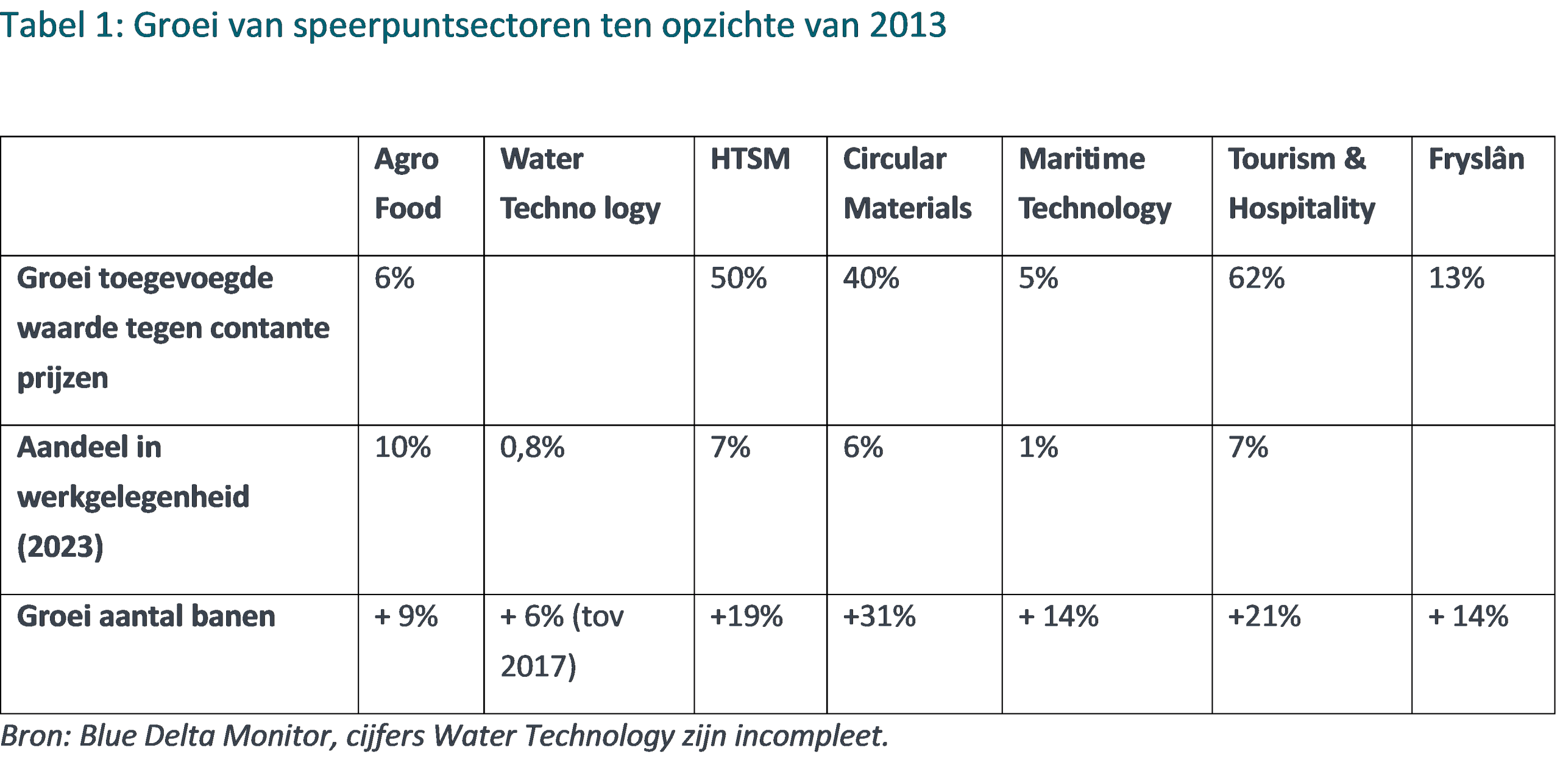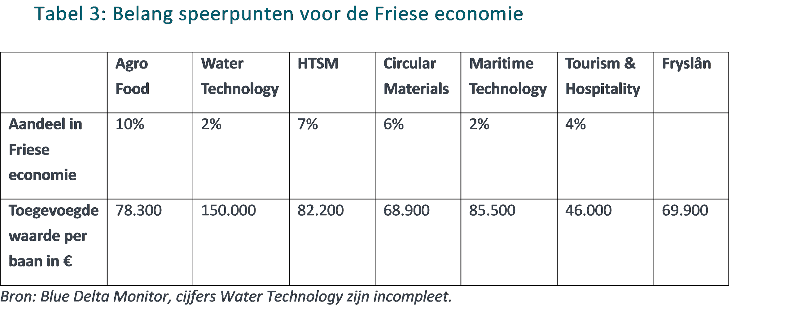 Water Technology heeft een zeer hoge toegevoegde waarde per baan, maar (nog?) een beperkt aandeel in de Friese economie. Hoewel de groeicijfers moeilijk te vergelijken zijn, kan op basis van andere indicatoren gesteld worden dat hier wel sprake is van potentie. Denk daarbij aan bijvoorbeeld de patentaanvragen als gevolg van het kenniscentrum Wetsus in Leeuwarden. Dit is ook vanuit de bijdrage aan (mondiale) brede welvaart een belangrijk speerpunt.