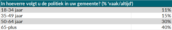Bijna een kwart van de inwoners van Fryslân (24%) volgt de politiek in de eigen gemeente intensief. Het grootste deel – bijna de helft (49%) – geeft aan dat zo nu en dan te doen. Het volgen van de lokale politiek neemt toe met het klimmen van de leeftijd. Van de jongvolwassenen (18-34 jaar) geeft één op de negen aan de lokale politiek intensief te volgen. Van de 65-plussers is dat vier op de tien.
