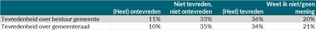 Een even grote groep neemt een middenpositie in (‘niet tevreden, niet ontevreden’); ongeveer één op de tien is uitgesproken ontevreden. Degenen die de lokale politiek intensief volgen zijn vaker tevreden over het bestuur van de gemeente (47%) en de gemeenteraad (42%) dan degenen die dat niet doen (resp. 33 en 32%).
