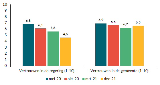 In het algemeen stellen de inwoners van Fryslân meer vertrouwen in de lokale dan in de landelijke overheid. Waar het vertrouwen in de regering (4,6) en de Tweede Kamer (5,1) in de afgelopen maanden sterk is afgenomen, is het vertrouwen in de gemeente stabiel (6,5). Ongeveer een derde van de inwoners zegt (heel) tevreden te zijn over het bestuur van de gemeente en over de gemeenteraad.