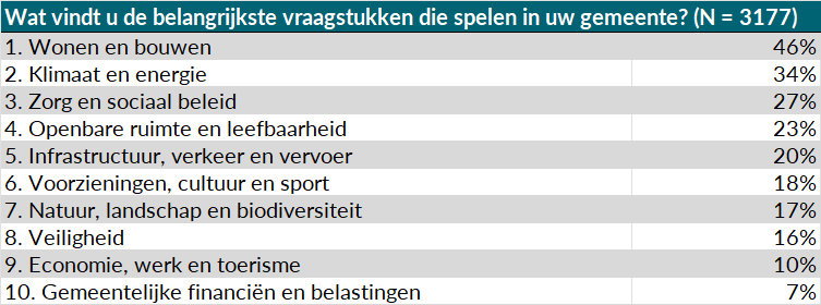 Gevraagd naar de belangrijkste vraagstukken die spelen in de gemeente, wordt ‘wonen en bouwen’ veruit het vaakst genoemd door de inwoners. Na wonen is ‘klimaat en energie’ het vaakst genoemde thema (34%). Hieronder vallen ook begrippen als ‘milieu’ en ‘duurzaamheid’. De top-3 wordt afgesloten met ‘zorg en sociaal beleid’, dat door ruim een kwart van de inwoners (27%) wordt genoemd. Grote deelonderwerpen hierbinnen zijn ouderenzorg, jeugdzorg, en armoedebeleid.