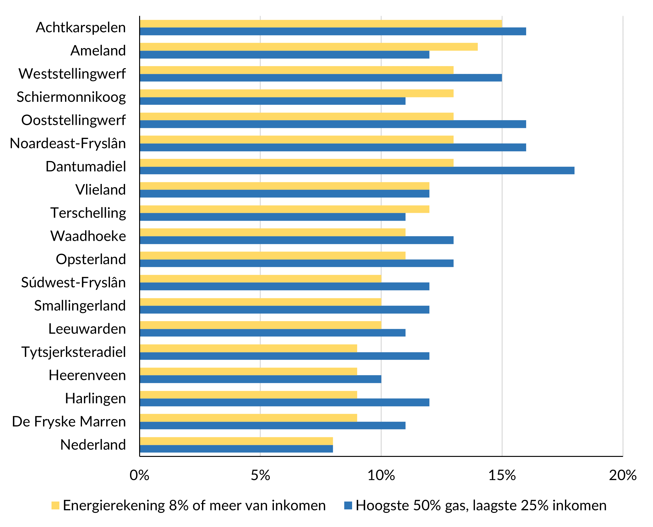 De beschikbare cijfers laten zien dat in Fryslân relatief veel huishoudens te maken hebben met (risico op) energiearmoede. Bij alle gemeenten in Fryslân ligt het aandeel huishoudens met een hoge energiequote (8% of meer van het inkomen) hoger dan het landelijk gemiddelde. Wel zijn er duidelijke verschillen tussen gemeenten. Met name in Noordoost Friesland (Dantumadiel, Achtkarspelen, Noardeast-Fryslân) en de Stellingwerven is het aandeel huishoudens met een relatief laag inkomen én relatief hoge energiekosten groot.