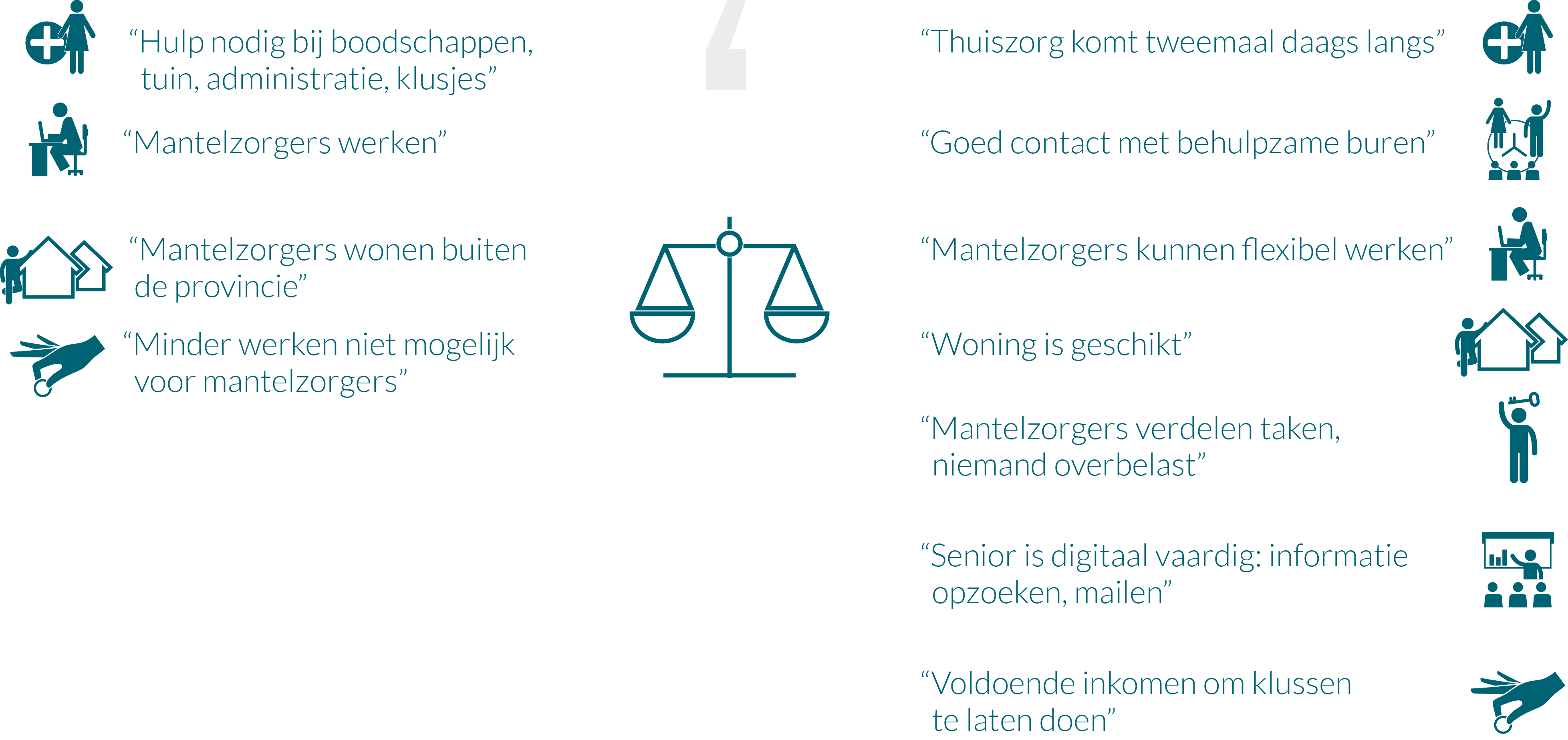 Toch lukt het een aantal instanties om wel over ‘de schotten van hun domeinen’ heen met elkaar samen te werken. Hun succesfactor? Het welzijn van de senioren staat centraal. Ze waarderen elkaars inzet en expertise en ze gaan creatief en flexibel om met protocollen en financiën. Ze starten niet met de vraag hoe organisaties het beste samen kunnen werken aan samenhang in ondersteuning van senioren. Nee, ze draaien het om: het leven van senioren is een samenhangend geheel, samenwerking is dus een logisch gevolg.
